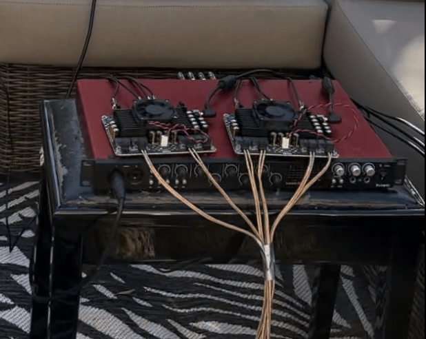 The information flow of the sound begins with the source material on the MacBook Pro, is routed internally through Blackhole and Waveform 13, out to the Focusrite 18i20 USB audio interface, and out to multichannel amplifier boards for each respective channel. The Focusrite was chosen for maximum control over the outputted the sound, and the Class D amplifier boards are excellent mid to high power boards with high clarity and low distortion. Though Class D amplifiers can have a slight hiss when playing no sound, this effect is less pronounced in this particular model (technically a Class T) and much less noticeable outside, so the experience for the guests is unaffected.
